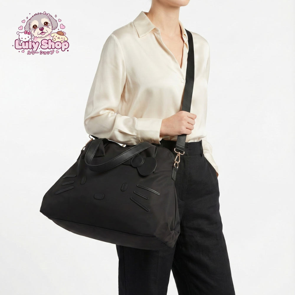 O visual é clean e preto, com aquele toque fofo e clássico da Hello Kitty que nunca erra. Tem bolsos internos pra evitar bagunça, alças reforçadas e, claro, a cereja do bolo: alça traseira pra encaixar na mala e viajar sem sofrer. Funcional, estilosa e zero drama — só praticidade com charme.